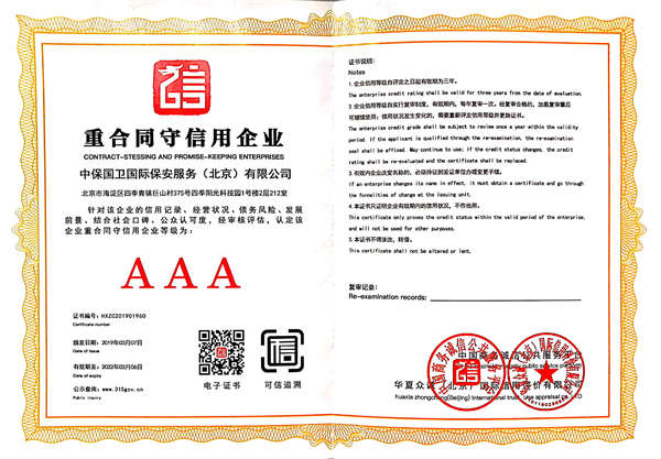 中保國衛國際保安服務(北京)有限公司,屬中保國衛集團旗下子公司。能全方位的為大型客戶提供優質的安保、押運服務,是集人防和技防于一體的新型正規化綜合安保押運服務企業,提供人防、物防、技防、聯網報*、非武裝押運等安防相關的一站式服務。 公司在國內多省設立有分公司及分支機構,著重提升安全押運、智能技術押運及安全技術防范相關的服務,業務范圍覆蓋全國一、二線城市、港澳地區以及海外地區。安保方面主要為政府機構、金融機構、企事業單位、醫療衛生、高等院校、工業園區、大型商場、高檔住宅、智能商務樓、大型活動提供門衛、守護、巡邏、押運(非武裝)、安全檢查、保安特勤、私人護衛、消防中控、安全技術防范、遠洋護航等全方位服務,同時面向國際市場,為中資企業在“一帶一路”沿線國家投資提供境外安保服務。 >> 更多內容 |